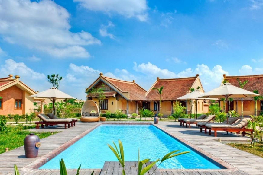 Emeralda Resort Ninh Bình được ví như một "ngôi làng xanh" giữa vùng đất núi non trùng điệp. Khu nghỉ dưỡng này nổi bật với kiến trúc đậm nét văn hóa Việt: mái ngói đỏ, sân gạch lát, và các căn phòng bao quanh bởi vườn cây xanh mát.