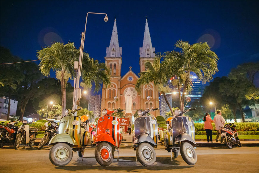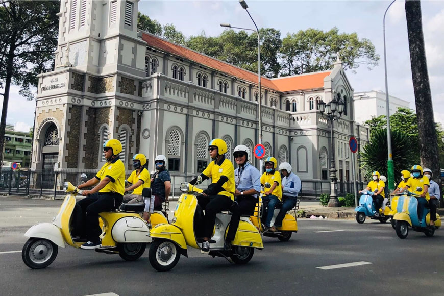 Trên chiếc Vespa, bạn có thể dạo qua Nhà thờ Đức Bà, Bưu điện Thành phố, Dinh Độc Lập hay các con phố sầm uất như Đồng Khởi, Nguyễn Huệ.