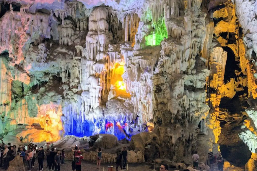 Điểm dừng chân đầu tiên là Động Thiên Cung, một trong những hang động lộng lẫy và nổi bật nhất tại Vịnh Hạ Long. Khi bước vào hang, bạn sẽ cảm nhận như đang lạc vào một thế giới cổ tích, nơi những khối thạch nhũ lấp lánh và không gian rộng lớn hiện ra trước mắt. Đây chính là tác phẩm nghệ thuật mà thiên nhiên đã dày công tạo dựng qua hàng triệu năm.