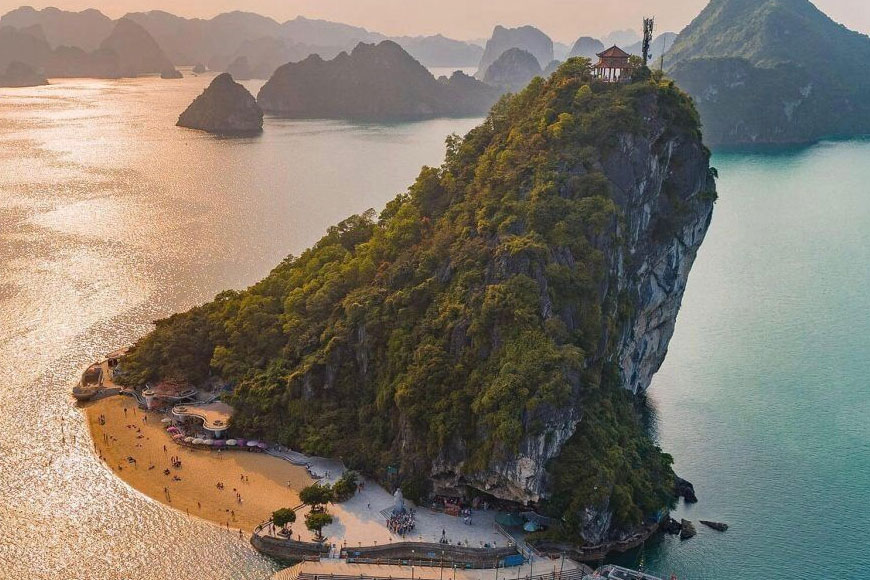 Đảo Titop là điểm đến tiếp theo, nơi mà bạn có thể chiêm ngưỡng toàn cảnh Vịnh Hạ Long từ đỉnh núi. Chỉ cần leo lên đỉnh đảo, bạn sẽ thấy mình đứng giữa một bức tranh thiên nhiên tuyệt đẹp với biển xanh, đảo đá và bầu trời trong lành. Nếu muốn thư giãn, bãi biển cát trắng mịn dưới chân đảo là nơi lý tưởng để tận hưởng làn nước trong xanh và cảm giác bình yên.