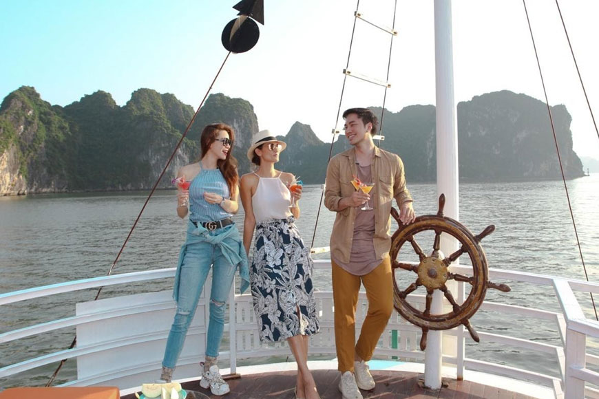Tận dụng các góc trên tàu: Boong tàu, lan can với nền biển hoặc cabin có cửa kính là những góc chụp lý tưởng.