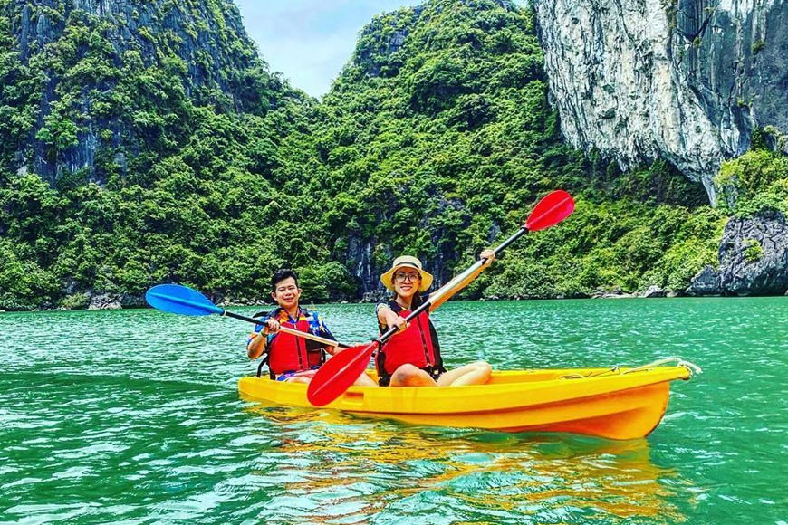 Một trong những trải nghiệm thú vị khác là chèo kayak hoặc đi thuyền nhỏ xuyên qua Hang Luồn. Dòng nước trong xanh phản chiếu mây trời và bóng núi tạo nên khung cảnh thơ mộng.