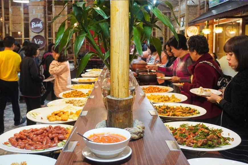 Bên cạnh không gian, nhà hàng còn ghi điểm với thực đơn buffet đa dạng, phong phú, đáp ứng mọi khẩu vị của thực khách. Từ các món sashimi cá hồi, bạch tuộc, hàu tươi sống đến các món nướng như mực, tôm hay những món ăn dân dã như xôi, bún, lẩu đều được chuẩn bị kỹ lưỡng.