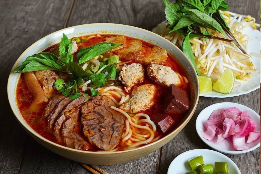 Bún bò Huế không chỉ là biểu tượng của ẩm thực Huế mà còn nổi tiếng khắp ba miền Việt Nam. Một tô bún bò Huế hoàn chỉnh bao gồm bún sợi to, dai, thịt bò thái lát mỏng, giò heo, chả cua, huyết heo và nước dùng được ninh từ xương bò, thêm chút mắm ruốc, sả và gia vị. Bún bò Huế có sự khác biệt lớn so với bún bò ở các vùng khác nhờ vị ngọt thanh từ nước dùng và độ cay vừa phải, thấm đẫm vào từng miếng thịt và sợi bún.