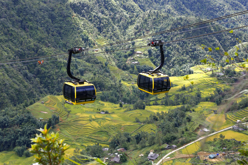 Nếu không muốn mạo hiểm với đường bộ, du khách có thể chọn đi cáp treo để nhanh chóng lên đỉnh Fansipan. Hệ thống cáp treo Fansipan được thiết kế để phục vụ khách tham quan với tầm nhìn rộng lớn và thời gian di chuyển chỉ mất khoảng 20 phút.